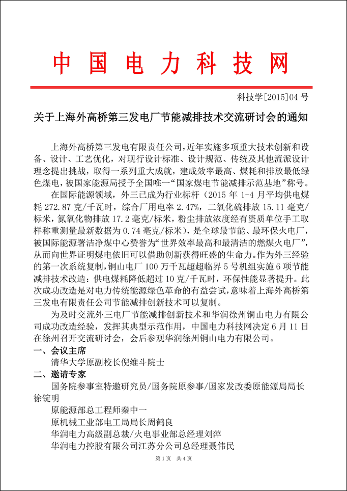 上海外高橋第三發電廠節能減排技術交流研討會報道 主辦單位:中國電力科技網 召開時間:2015年6月11日 召開地點:徐州 上海外高橋第三發電廠節能減排技術交流研討會報道鐘靈毓秀,人杰地靈,千年帝都,東方雅典,為及時交流華潤銅山電力有限公司節能減排成功改 ……